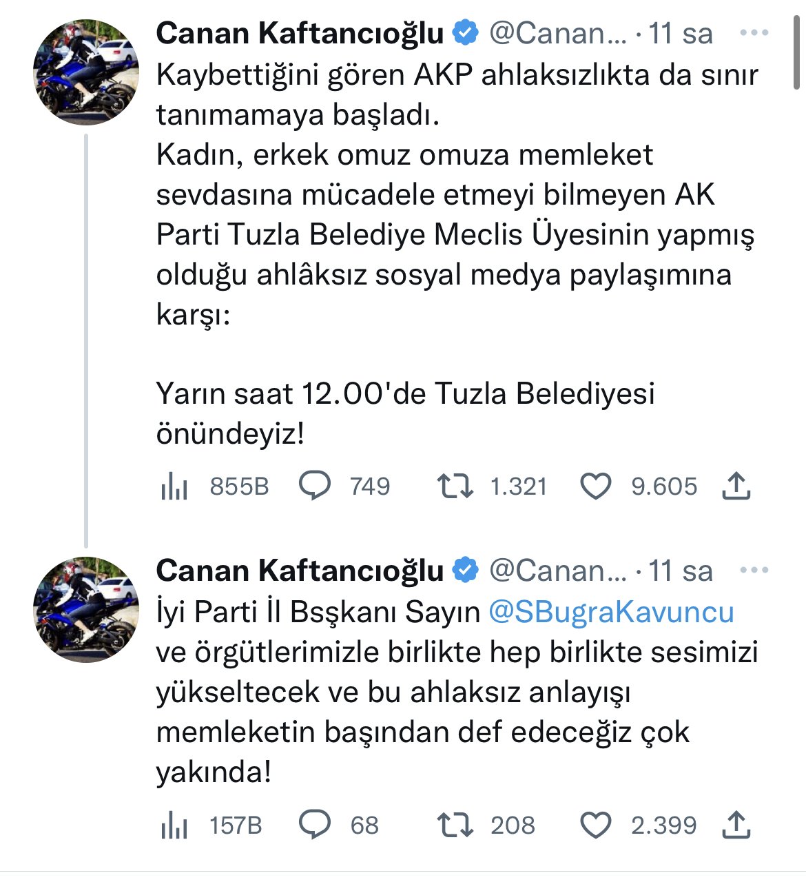İYİ Parti İstanbul İl Başkanı Buğra Kavuncu ise, “AK Parti Tuzla Belediye Meclis Üyesinin yapmış olduğu ahlâksız sosyal medya paylaşımına tepkimizi yarın gür bir sesle göstereceğiz.