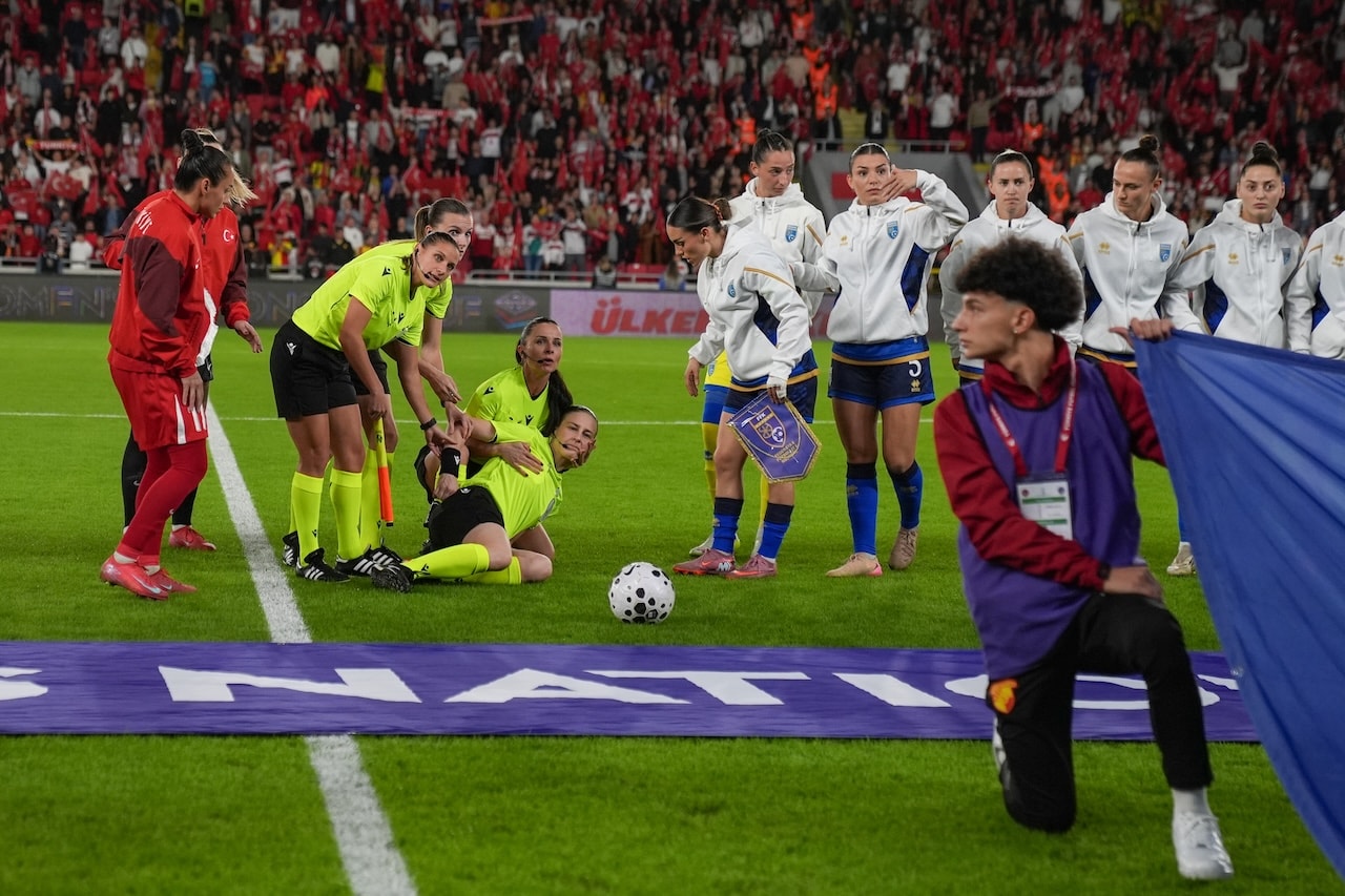 UEFA Uluslar B Ligi play-out rövanş müsabakasında Türkiye ile Kosova İzmir Gürsel Aksel Stadında karşılaşmasında ulusal marşlar okunurken maçın orta hakemi Michalina Diakow fenalaşarak yerde kaldı.