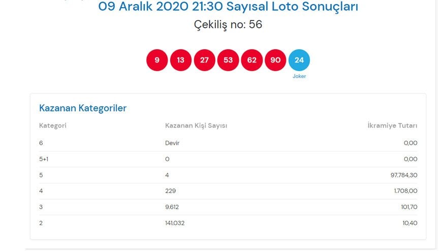 Çılgın Sayısal Loto’nun 9 Aralık tarihli çekiliş sonuçları şu şekilde: 9-13-27-53-62-90 Joker: 24
