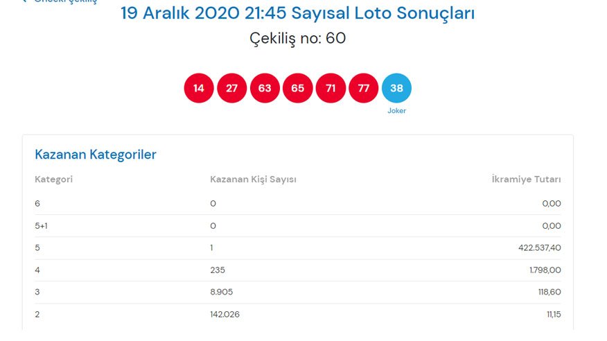 Çılgın Sayısal Loto’nun 19 Aralık 2020 tarihli 60. çekilişinde şanslı rakamlar “14-27-63-65-71-77 Joker: 38” olarak açıklandı.