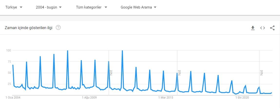 Google Trends arama istatistiklerine göre her yılbaşında pik yapan Milli Piyango araması son senelerde beklenen ilgiyi görmedi. Bu sene ise henüz çekiliş gerçekleşmese de biletlere ve ikramiye tutarlarına ait aramalar tabloda önemli bir hareketlenme yaşatamadı.