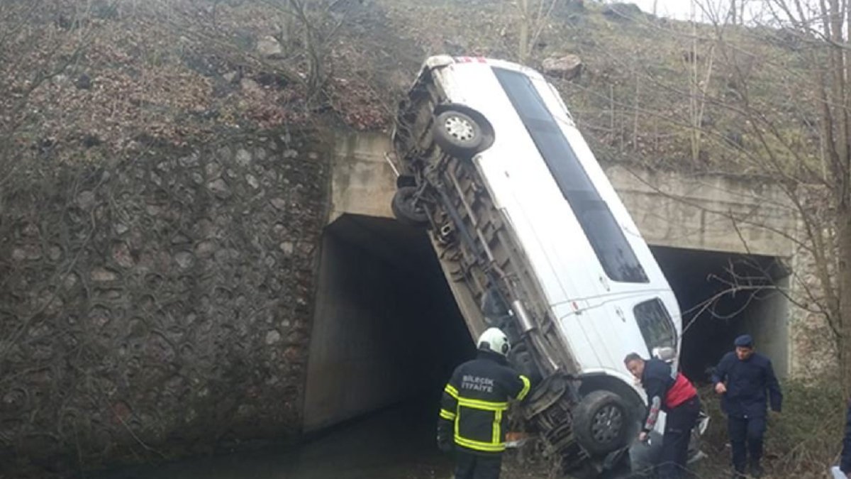 Bilecik'te, kontrolden çıkarak dere yatağına düşen minibüsteki şoför dahil 13 kişi yaralandı.