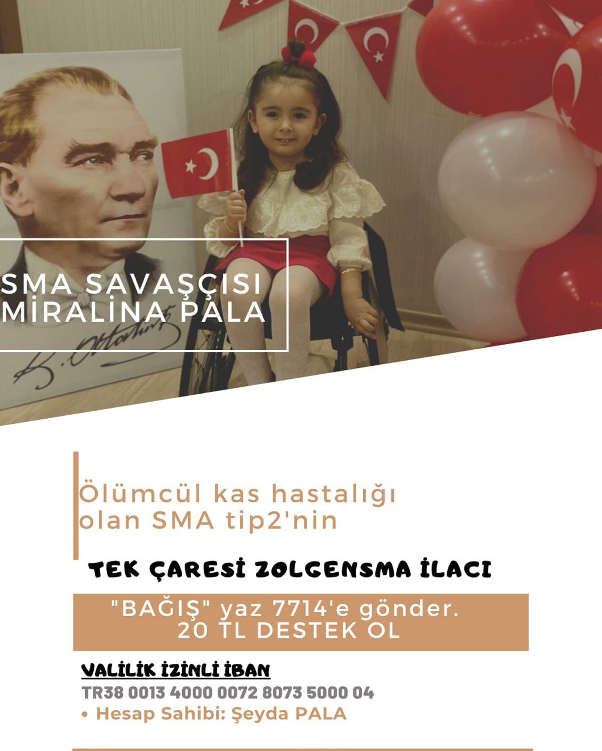 9 Haziran’da 3 yaşına girecek olan Mira Lina Pala iki yıldır kas gelişimini engelleyen bu hastalıkla mücadele ediyor. Hastalığın tedavisini sağlayan Zolgensma isimli ilaç Mira için kalıcı tek çözüm. Tedavi için yurtdışındaki bir hastane 2.2 milyon dolar istedi. Ailesi bağış kampanyası başlattı. Kampanyada şu an tedavi masraflarının yüzde 51’i toplandı. Ankara Valiliği bir yıl bağış toplama izni verdi. Yardımlar ilgili IBAN adresinden ve SMS kampanyasıyla toplanıyor.