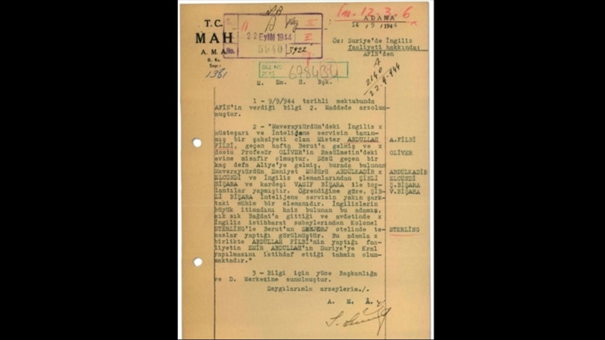 Adana Merkez Amirliği'ne ait 14 Eylül 1944 tarihli istihbarat raporunda şu ifadeler yer aldı: