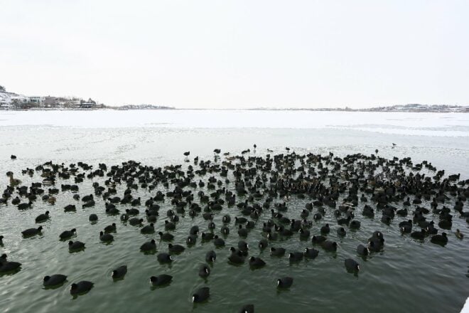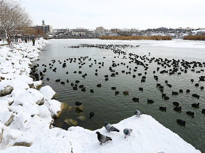 Vatandaşlar, gölde yiyecek bulmakta zorlanan karabatak kuşlarını ekmek atarak besledi.