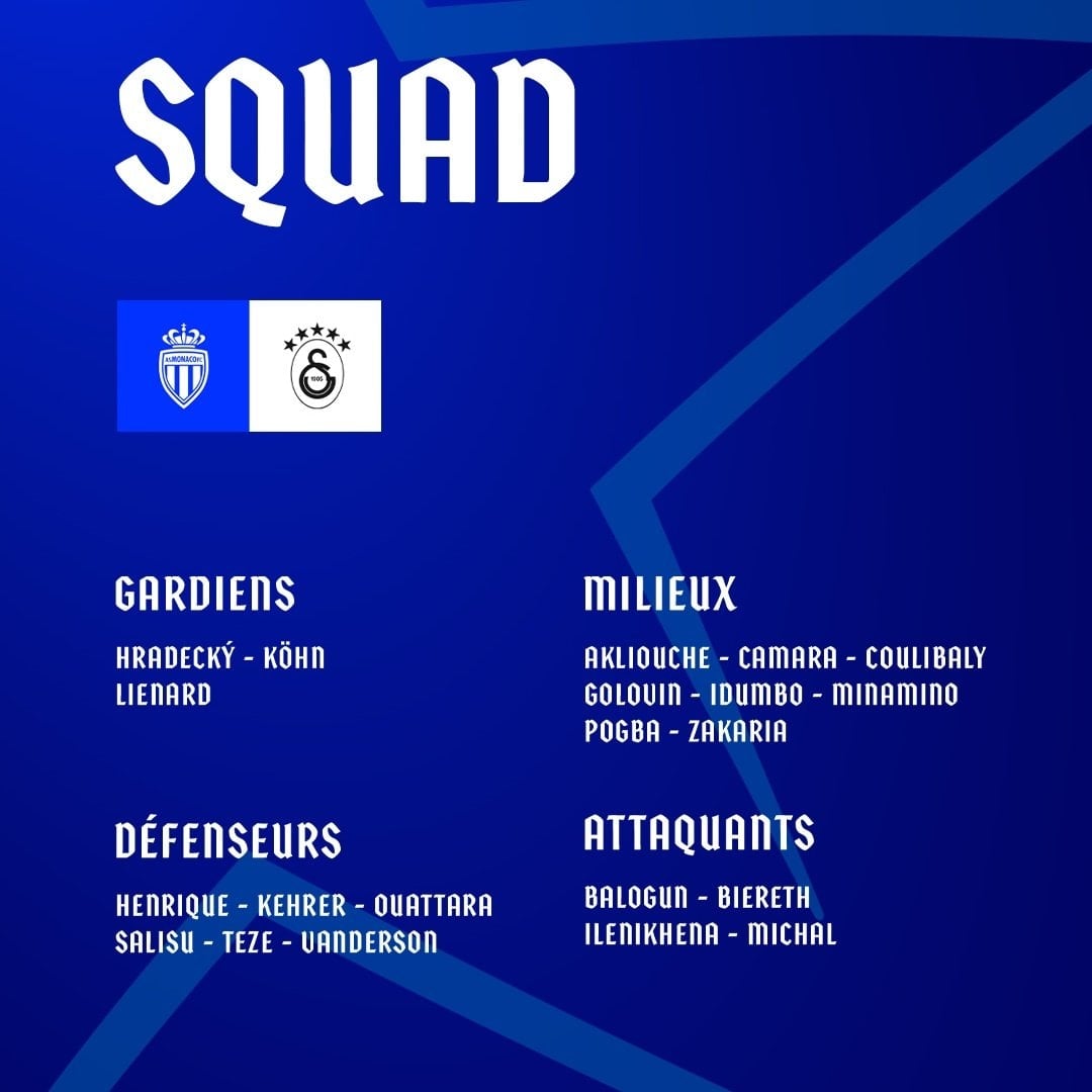 Fransa temsilcisi Monaco da kamp kadrosunu açıkladı. Fransız ekibi 3 oyuncusunu Galatasaray karşısında kullanamayacak. Monaco, Eric Dier, Christian Mawissa ve Ansu Fati'nin sakatlığı nedeniyle Galatasaray maçı kadrosuna alınmadığını duyurdu.