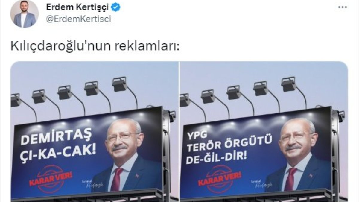 Kertişçi’nin ‘Kılıçdaroğlu’nun reklamları’ notuyla paylaştığı, Kılıçdaroğlu’nun fotoğrafının olduğu sahte iki afişte ‘Demirtaş çıkacak’ ve ‘YPG terör örgütü değildir’ ifadeleri yer aldı. Kertişçi’nin paylaşımına tepki yağarken, Teyit.org afişlerin montaj olduğunu açıkladı.