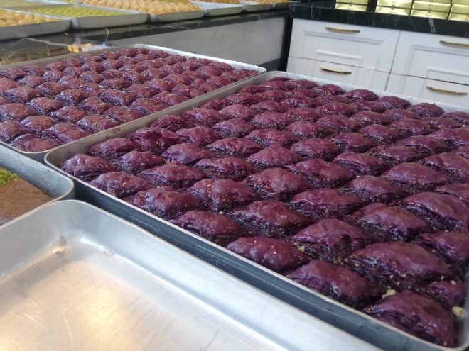 Ankara'da faaliyet gösteren bir tatlıcı zincirinin şubelerinde satışa çıkarılan mor baklava, dikkat çekti. Siyah havuç, nar, böğürtlen, vişne, kırmızı pancar gibi mor meyve ve sebzelerin özüyle hazırlanan mor baklavaya olan talep son dönemde arttı. Klasik baklavalardan renginin yanında şeker oranının daha az olması nedeniyle de farklı olan mor baklavaya bu yüzden ilgi de yoğun oldu.