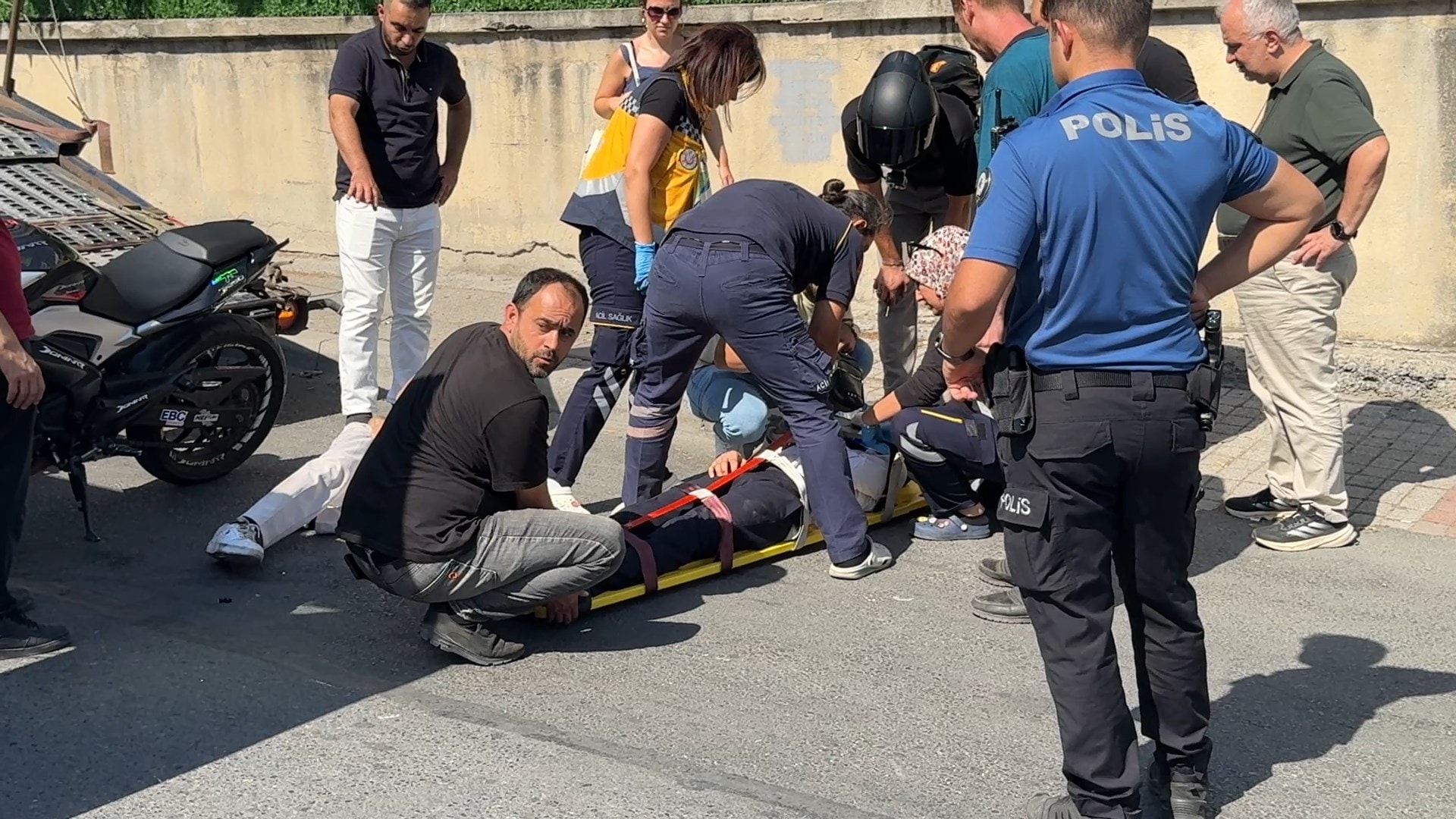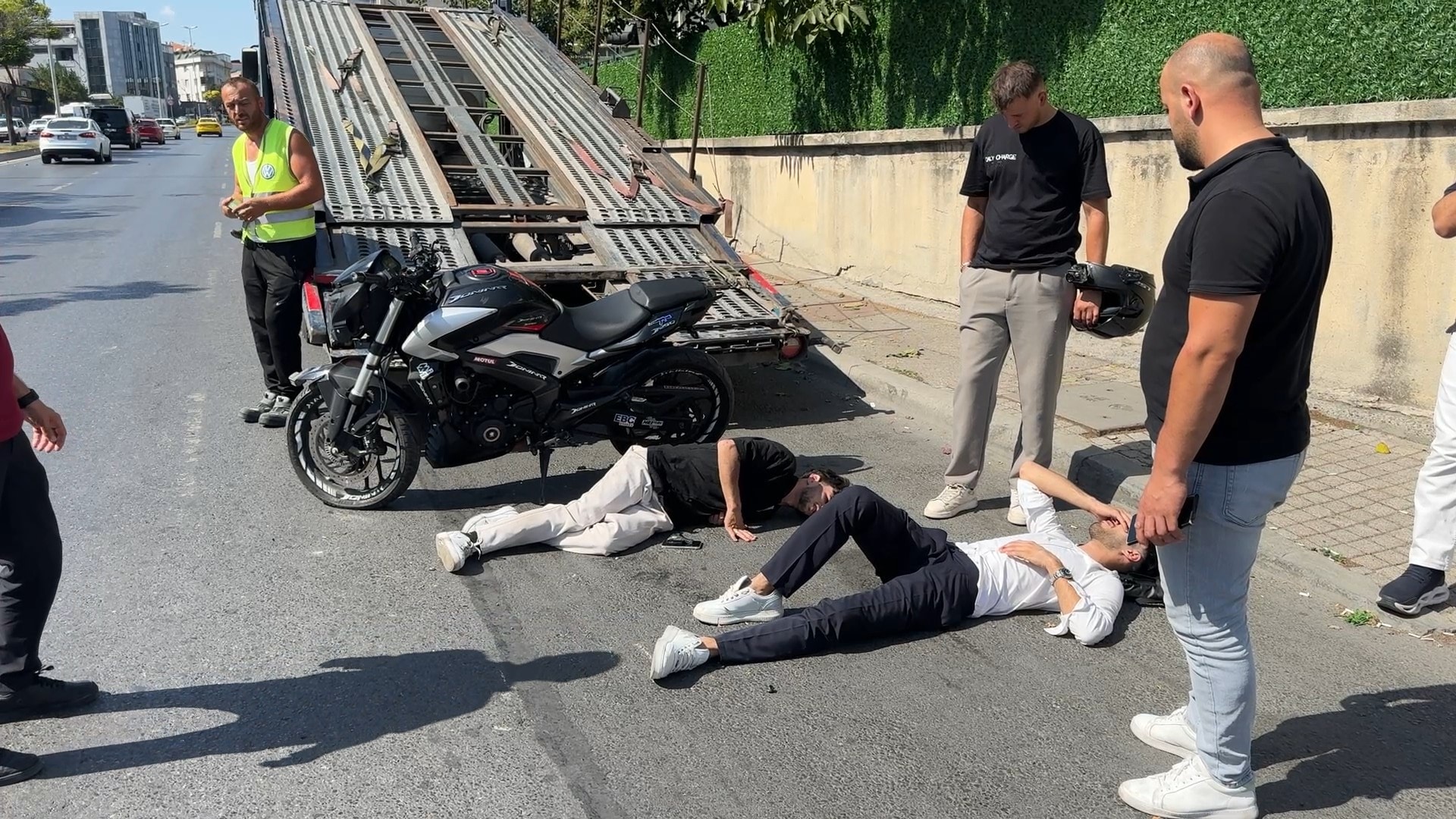 Çarpmanın şiddetiyle motosiklette bulunan iki kişiden biri yola savrulurken, diğeri çekicinin kasasına düştükten sonra yere yuvarlandı. İhbar üzerine olay yerine polis ve sağlık ekipleri sevk edildi.
