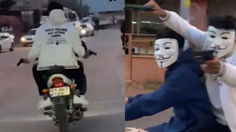 Serik ilçesi Merkez Mahallesi Salı Pazarı civarında akşam saatlerinde motosiklet üzerinde, yüzlerinde maske bulunan iki gençten arkada oturan, seyir halindeyken iki elindeki iki tabancayla, yol güzergahındaki sürücü ve vatandaşlara korku dolu anlar yaşattı. Diğer motosiklet üzerindeki arkadaşları cep telefonuyla o anları kaydederken, maskeli gencin ellerindeki silahı vatandaşlara doğrultması korku dolu anlara neden oldu.