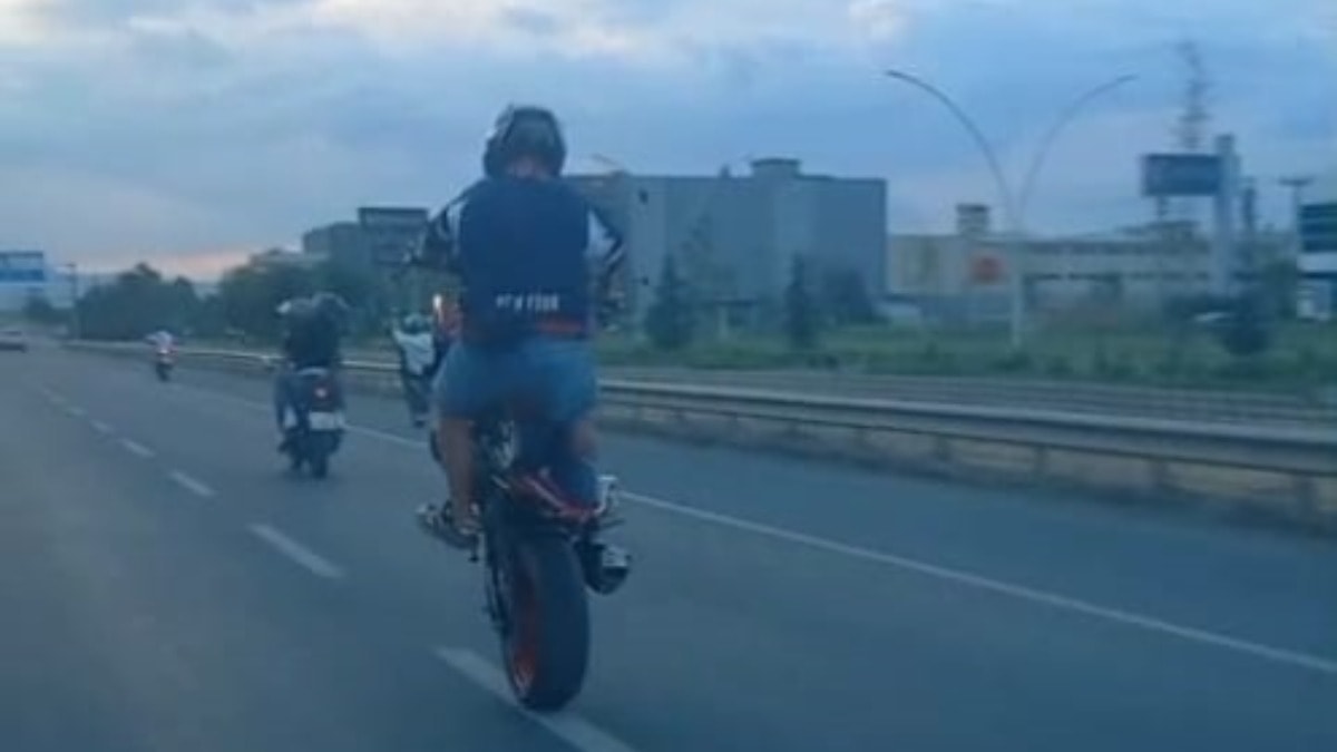 Alınan bilgiye göre Bursa- Ankara karayolunda seyir halinde olan 3 motosikletli genç, araçlarının önünü kaldırarak ilerledi. Trafik güvenliğini hiçe sayan sürücüler, metrelerce yol kat etti. O anlar vatandaşlar tarafından cep telefonu kamerasıyla kaydedildi.