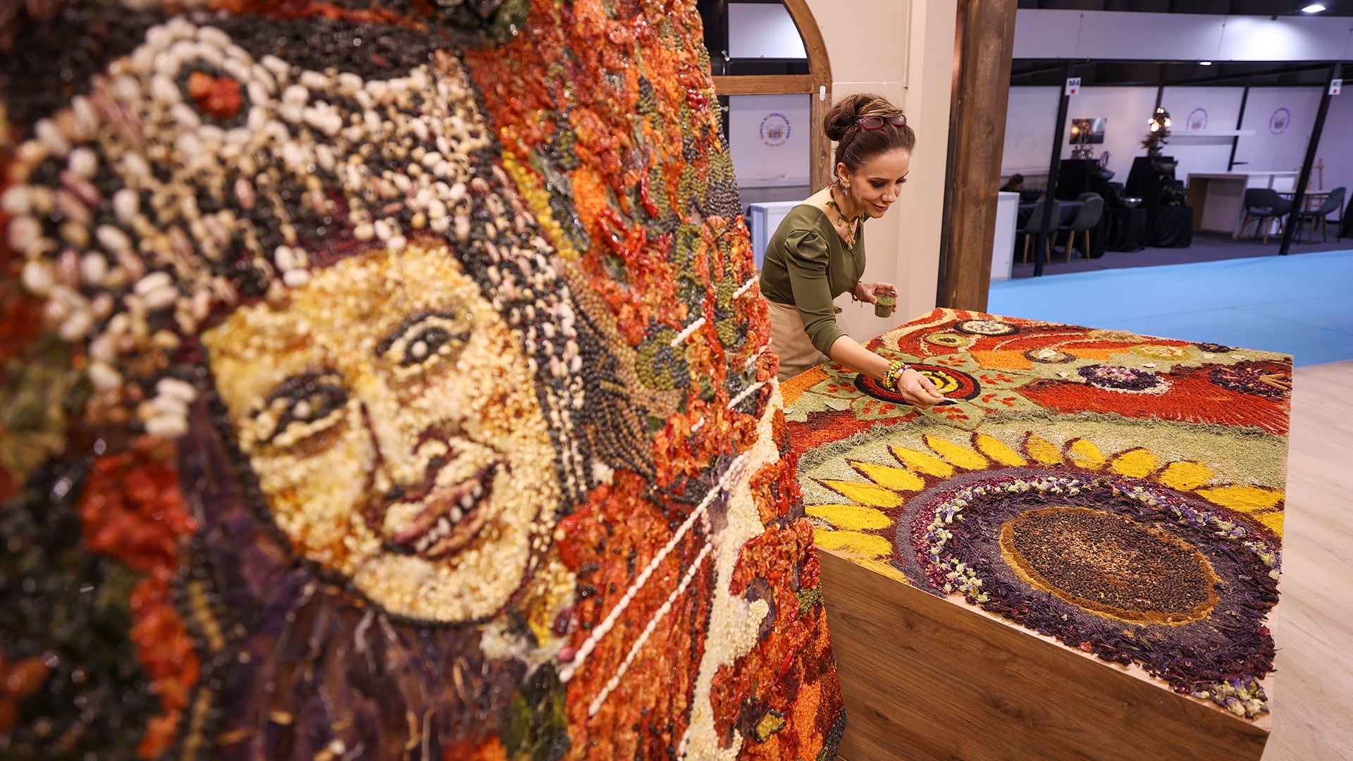 Gaziantep Büyükşehir Belediyesi Jale Tekinalp Yücel Kültür ve Sanat Merkezi Koordinatörü Gülçin Sökücü, Ticaret Bakanlığı'nın Cumhuriyet'in 100'üncü yılı kutlamaları için düzenlediği fuarda sanatını baharatlarla konuşturdu.