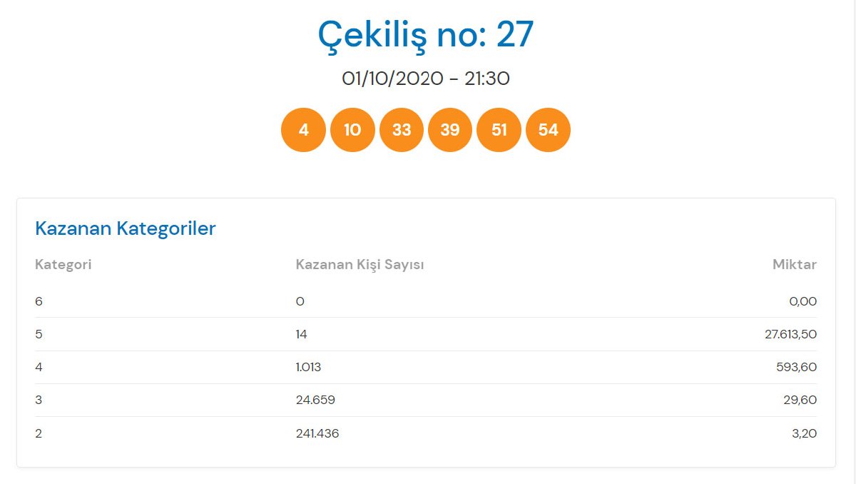 Süper Loto'nun 1 Ekim tarihli 27. çekiliş sonuçları şu şekilde; 4-10-33-39-51-54