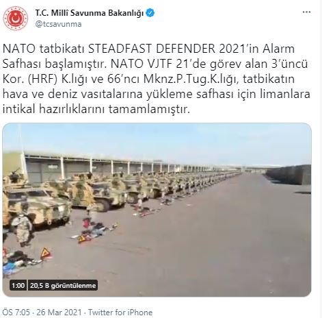 MSB, sosyal paylaşım sitesi Twitter hesabından tatbikatla ilgili yaptığı paylaşımda, “NATO tatbikatı STEADFAST DEFENDER 2021’in Alarm Safhası başlamıştır. NATO VJTF 21’de görev alan 3’üncü Kor. (HRF) Komutanlığı ve 66’ncı Mekanize Piyade Tugayı Komutanlığı, tatbikatın hava ve deniz vasıtalarına yükleme safhası için limanlara intikal hazırlıklarını tamamlamıştır” dedi.