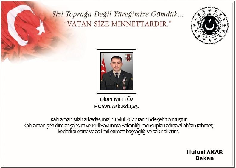 Milli Savunma Bakanı Hulusi Akar, Şehit Astsubay Kıdemli Çavuş Okan Meteöz için başsağlığı mesajı yayımladı. Bakan Akar mesajında, "Kahraman silah arkadaşımız, 1 Eylül 2022 tarihinde şehit olmuştur. Kahraman şehidimize şahsım ve Milli Savunma Bakanlığı mensupları adına Allah'tan rahmet; kederli ailesine ve asil milletimize başsağlığı ve sabır dilerim" ifadelerine yer verdi.