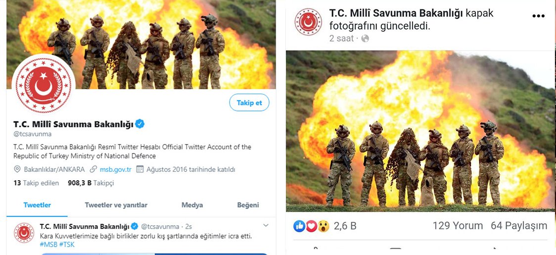MSB'nin değiştirdiği Facebook ve Twitter kapak fotoğrafları.13 Şubat'ta İdlib harekatı öncesinde gerilimin yükseldiği bir dönemde eklenen fotoğraf bugün saat 12.00 itibarıyla Su Altı Savunma (SAS) komandoları ile değiştirildi.