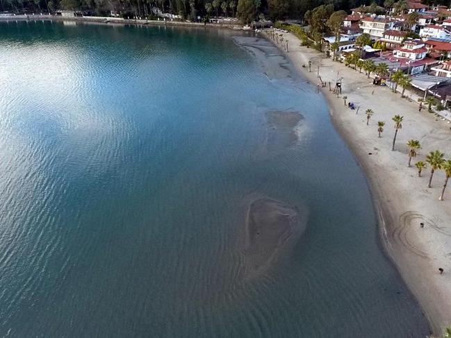 Muğla'nın Ula ilçesinde yerli ve yabancı turistlerin yoğun ilgi gösterdiği tatil bölgelerinden Akyaka'da deniz suyu 20 metre kadar çekildi. FOTO: DHA