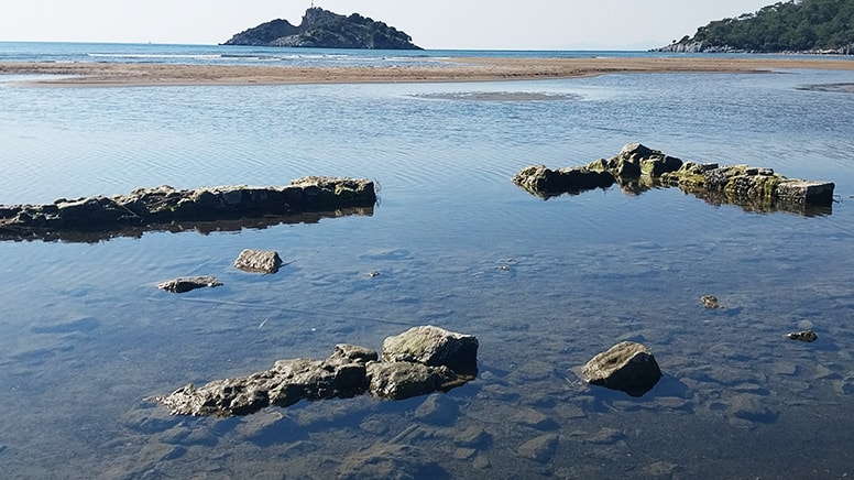 Sahilin Boğazağzı mevkisinde 60 yıl önce kullanılan gümrük binasının taş temel duvarları da suların çekilmesiyle su yüzüne çıktı.