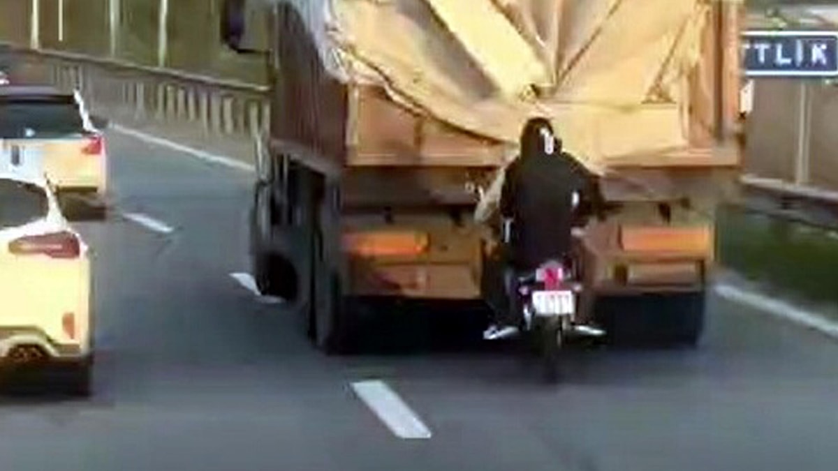 Aydın-Muğla kara yolunda arkasında yolcu ile giden kasksız motosiklet sürücüsü, bir eliyle önündeki kamyonunun kasasına tutundu, diğer eliyle de motosikleti kontrol edip ilerledi. Sürücünün tehlikeli yolculuğu, çevredekiler tarafından cep telefonuyla görüntülendi.