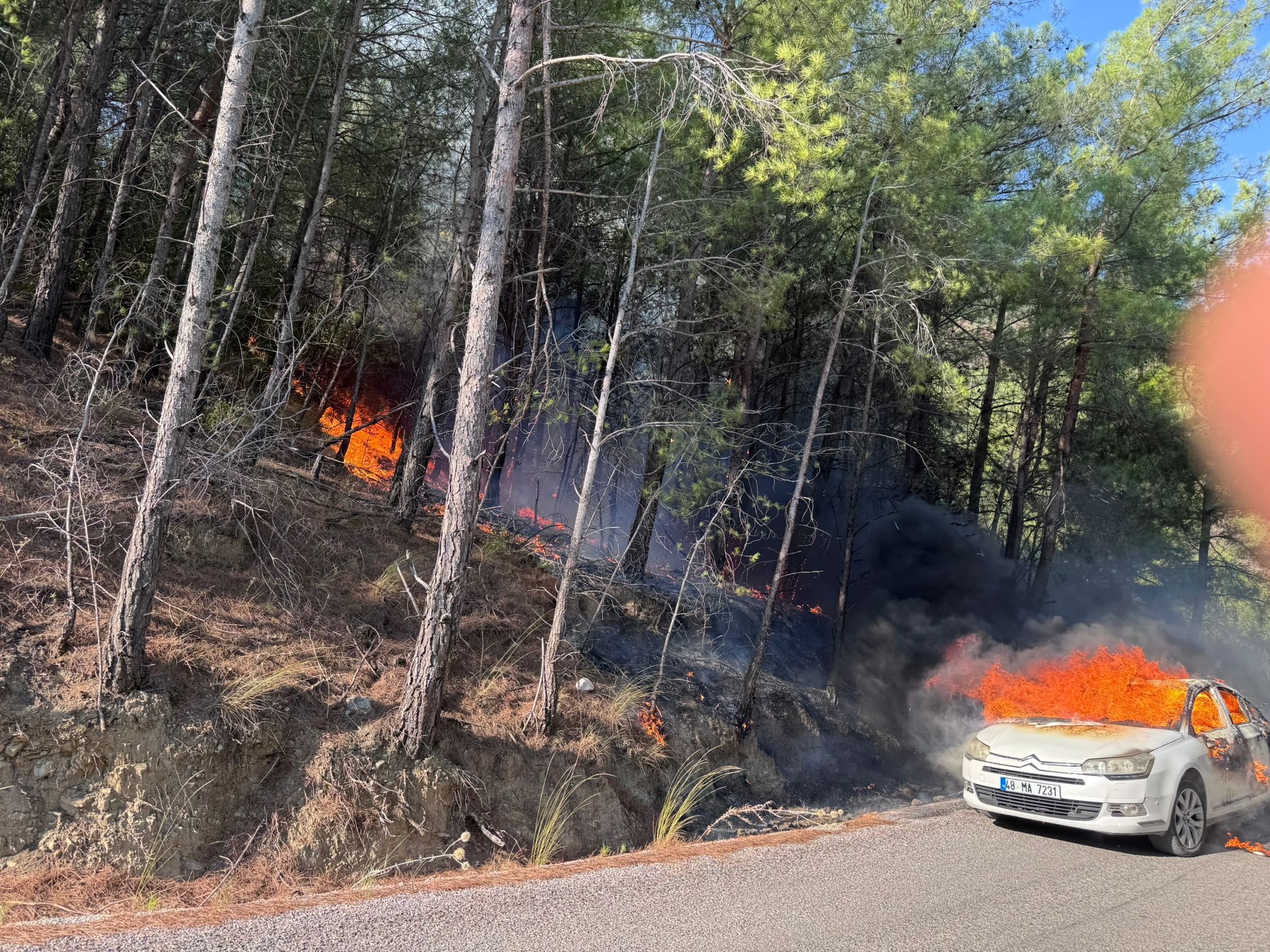 Alev alev yanan otomobil ve orman yangınını Muğla Orman Bölge Müdürlüğü’ne ait ekipler müdahale etti.