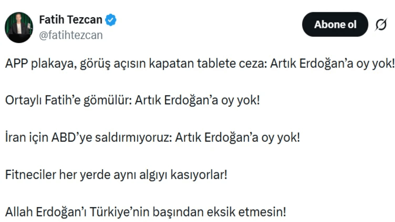 Muhafazakar camianın kalemlerinden Fatih Tezcan son günlerde kendi camialarında “Artık Erdoğan’a oy yok!” tepkisini ortaya çıkaran tartışmaları şöyle özetledi:
