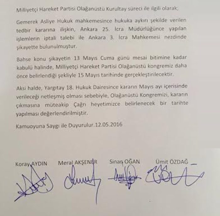 Yarın mesai bitimine kadar Ankara 3. İcra Mahkemesi'nden karar çıkması durumunda kurultay yapılacak. Karar çıkmazsa, yargıtayın vereceği karara göre ileri bir tarihte kurultay yapılacak.