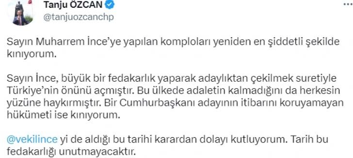 Bolu Belediye Başkanı Tanju Özcan ise, "Sayın Muharrem İnce’ye yapılan komploları yeniden en şiddetli şekilde kınıyorum. Sayın İnce, büyük bir fedakarlık yaparak adaylıktan çekilmek suretiyle Türkiye’nin önünü açmıştır. Bu ülkede adaletin kalmadığını da herkesin yüzüne haykırmıştır. Bir Cumhurbaşkanı adayının itibarını koruyamayan hükümeti ise kınıyorum. @vekilince yi de aldığı bu tarihi karardan dolayı kutluyorum. Tarih bu fedakarlığı unutmayacaktır" ifadelerini kullandı.