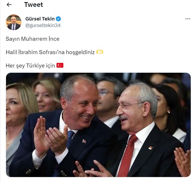 CHP İstanbul Milletvekili Gürsel Tekin, sosyal medyadan yaptığı paylaşımda, "Sayın Muharrem İnce Halil İbrahim Sofrası'na hoşgeldiniz. Her şey Türkiye için" ifadelerini kullandı.