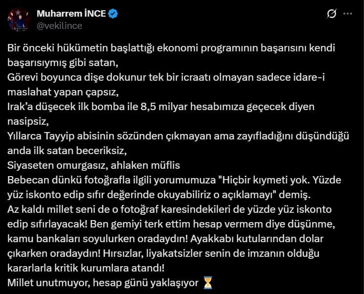 “Görevi boyunca dişe dokunur tek icraatı olmayan, yıllarca Tayyip abisinin sözünden çıkmayan ama zayıfladığını düşündüğü anda ilk fırsatta terk eden bir beceriksizsin. Ayakkabı kutularından dolar çıkarken oradaydın, kamu bankaları soyulurken imzan vardı. Millet seni de o fotoğraf karesindekileri de iskonto edip sıfırlayacak. Millet unutmuyor, hesap günü yaklaşıyor.”