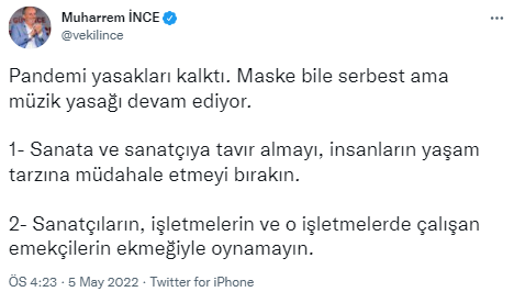“Pandemi yasakları kalktı. Maske bile serbest ama müzik yasağı devam ediyor. 1- Sanata ve sanatçıya tavır almayı, insanların yaşam tarzına müdahale etmeyi bırakın. 2- Sanatçıların, işletmelerin ve o işletmelerde çalışan emekçilerin ekmeğiyle oynamayın"