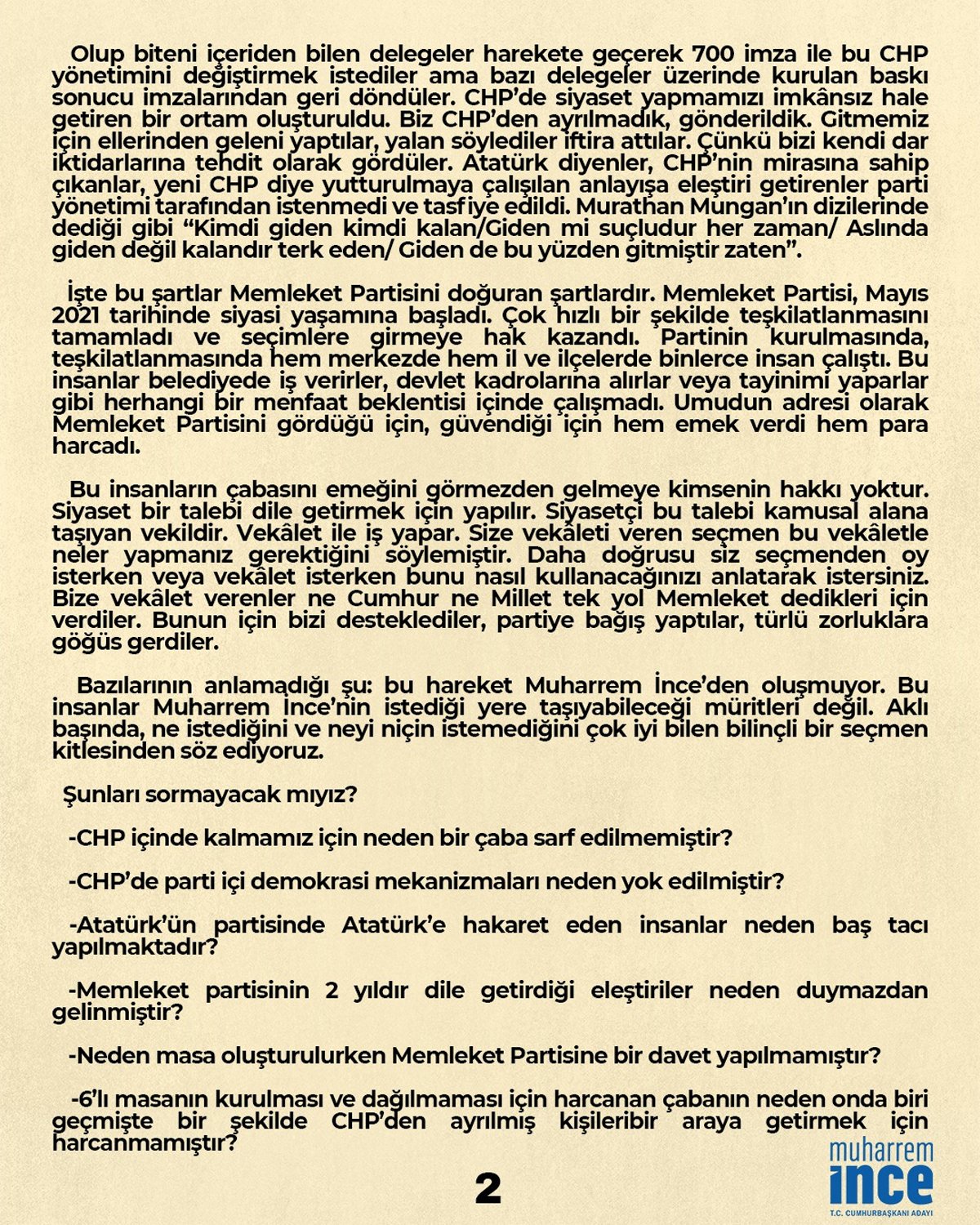 Cumhurbaşkanı adayı ve Memleket Partisi Genel Başkanı Muharrem İnce, sosyal medya hesabından 4 sayfalık açıklama yaptı.