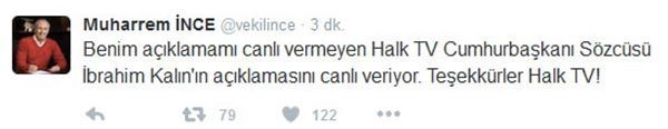 Bazı haber kanalları İnce'nin konuşmasını canlı verirken, CHP'ye yakınlığıyla bilinen Halk TV, İnce'nin konuşmalarına canlı olarak ekranında yer vermedi. Bunun üzerine Muharrem İnce Twitter hesabından Halk TV'ye sitem içeren bir paylaşımda bulundu. Muharrem İnce, 'Benim açıklamamı canlı vermeyen Halk TV Cumhurbaşkanı Sözcüsü İbrahim Kalın'ın açıklamasını canlı veriyor. Teşekkürler Halk TV!' ifadelerini kullandı.