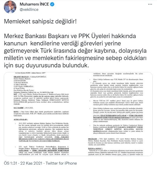 Ankara Cumhuriyet Başsavcılığı'na verilen dilekçeyi sosyal medya hesabından paylaşan Memleket Partisi Genel Başkanı Muharrem İnce, "Memleket sahipsiz değildir. Merkez Bankası Başkanı ve PPK Üyeleri hakkında kanunun  kendilerine verdiği görevleri yerine getirmeyerek Türk lirasında değer kaybına, dolayısıyla milletin ve memleketin fakirleşmesine sebep oldukları için suç duyurusunda bulunduk" ifadelerini kullandı.
