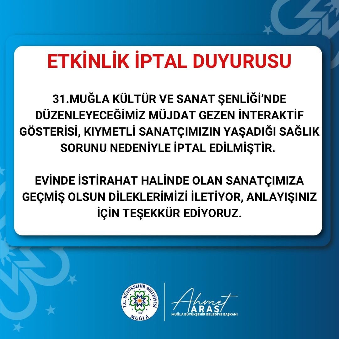 "31. Muğla Kültür ve Sanat Şenliği'nde düzenleyeceğimiz Müjdat Gezen interaktif gösterisi, kıymetli sanatçımızın yaşadığı sağlık sorunu nedeniyle iptal edilmiştir."