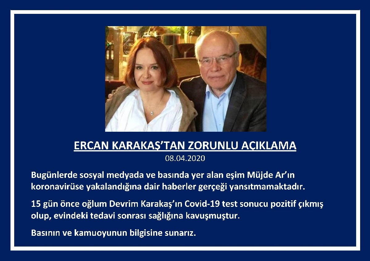 Müjde Ar'ın eşi Ercan Karakaş, "Zorunlu açıklama" başlığıyla yaptığı duyuruda, "Bugünlerde sosyal medyada ve basında yer alan eşim Müjde Ar'ın corona virüsüne yakalandığına dair haberler gerçeği yansıtmamaktadır. 15 gün önce oğlum Devrim Karakaş'ın Covid-19 test sonucu pozitif çıkmış olup, evindeki tedavisi sonrası sağlığına kavuşmuştur" ifadesini kullandı.