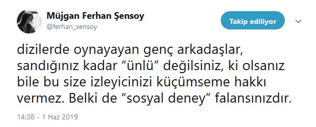 Ailesi gereği usta tiyatrocularla bir arada olma ve onları sahne üzerinde izleme fırsatı bulan Müjgan Ferhan Şensoy, hiç şüphesiz oyunculuk sektöründe başarılı olabilmek ya da kalıcı olmak adına nasıl davranılması ya da davranılmaması gerektiğini herkesten iyi bilen bir isim. Çevresinde çok sayıda oyuncu olan ve işin mutfağını iyi bilen Şensoy, sosyal medya hesabından yazdıklarıyla oyunculuk sektöründe boy gösteren genç isimleri uyardı. Çevresinde gördükleri karşısında yaşadığı rahatsızlığı twitter hesabından paylaşmayı tercih eden Müjgan Ferhan Şensoy şunları yazdı: