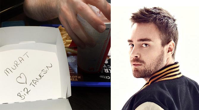 Merve Boluğur’la birlikte bir dönem ilişki yaşayan başarılı popçu Murat Dalkılıç, gittiği bir fast food restoranında karşılaştığı sürprizi takipçileriyle paylaşmış. Sipariş verdiği hamburger kutusunun içinde ‘Murat bir tanesin’ yazısıyla karşılaşınca yaşadığı şaşkınlığı “Hamburgeri bir açtım ki…” notuyla sevdiklerine iletmiş.