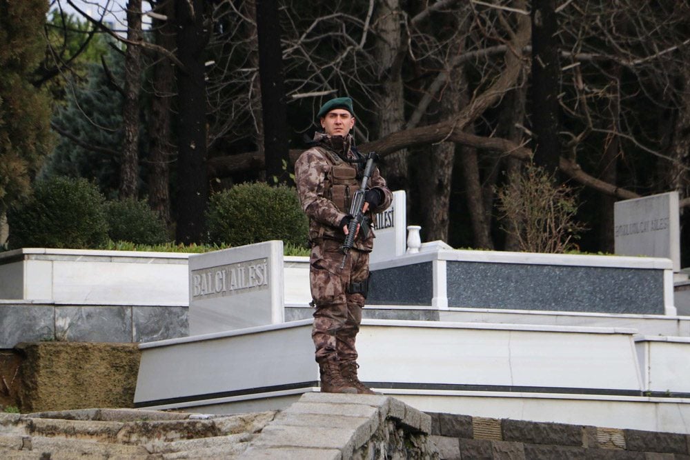 Özel Harekat polisinin mezarlık çevresinde yoğun güvenlik önlemi aldığı törene katılanlar ince aramdan geçirilerek tören alanına alındı.