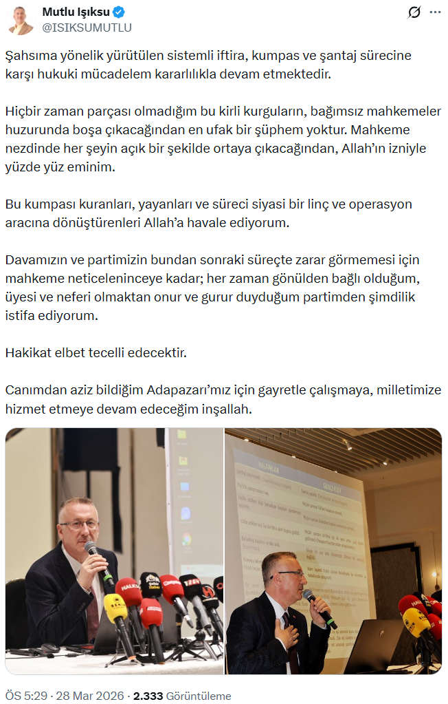İstifa gerekçesini "partisinin zarar görmemesi adına" aldığını belirten Adapazarı Belediye Başkanı, "Mahkeme neticeleninceye kadar; her zaman gönülden bağlı olduğum, üyesi ve neferi olmaktan onur ve gurur duyduğum partimden şimdilik istifa ediyorum" ifadelerini kullandı.