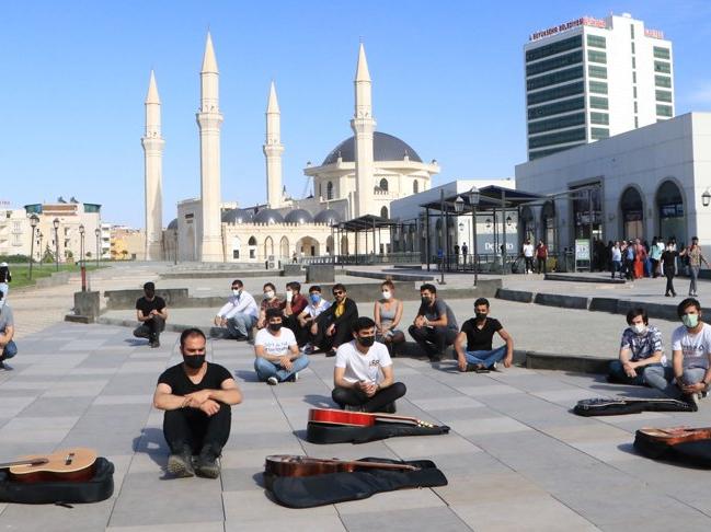 Şanlıurfa'da corona virüsü salgınına karşı alınan önlemler kapsamında eğlence sektörüne izin çıkmaması üzerine bir araya gelen müzisyenler, sessiz oturma eylemi yaptı.