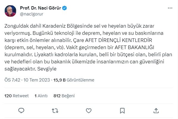 “Zonguldak dahil Karadeniz Bölgesinde sel ve heyelan büyük zarar veriyormuş. Bugünkü teknoloji ile deprem, heyelan ve su baskınlarına karşı etkin önlemler alınabilir. Çare afet dirençli kentlerdir (deprem, sel, heyelan, vb). Vakit geçirmeden bir Afet Bakanlığı kurulmalıdır. Liyakatlı kadrolarla kurulan, belli bir bütçesi olan, belirli plan ve hedefleri olan bu bakanlık ülkemizde insanlarımızın can güvenliğini sağlayacaktır.”
