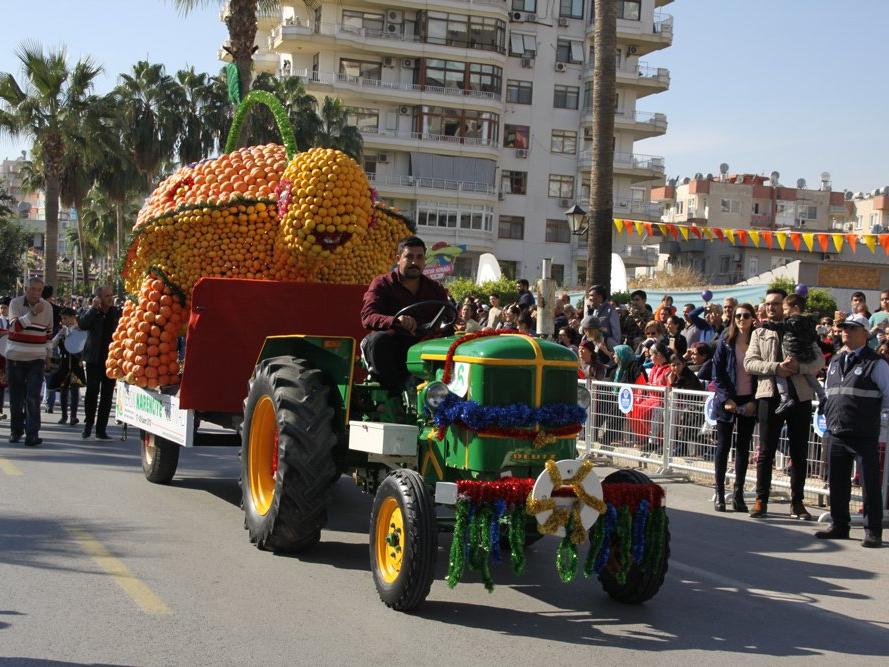 Çocuk grupları, bisikletli gezginler, tiyatro toplulukları, klasik otomobil severler ile narenciye üreticisi kadınların da yer aldığı kortejde farklı kültürleri yansıtan birbirinden ilginç danslar sergilendi.