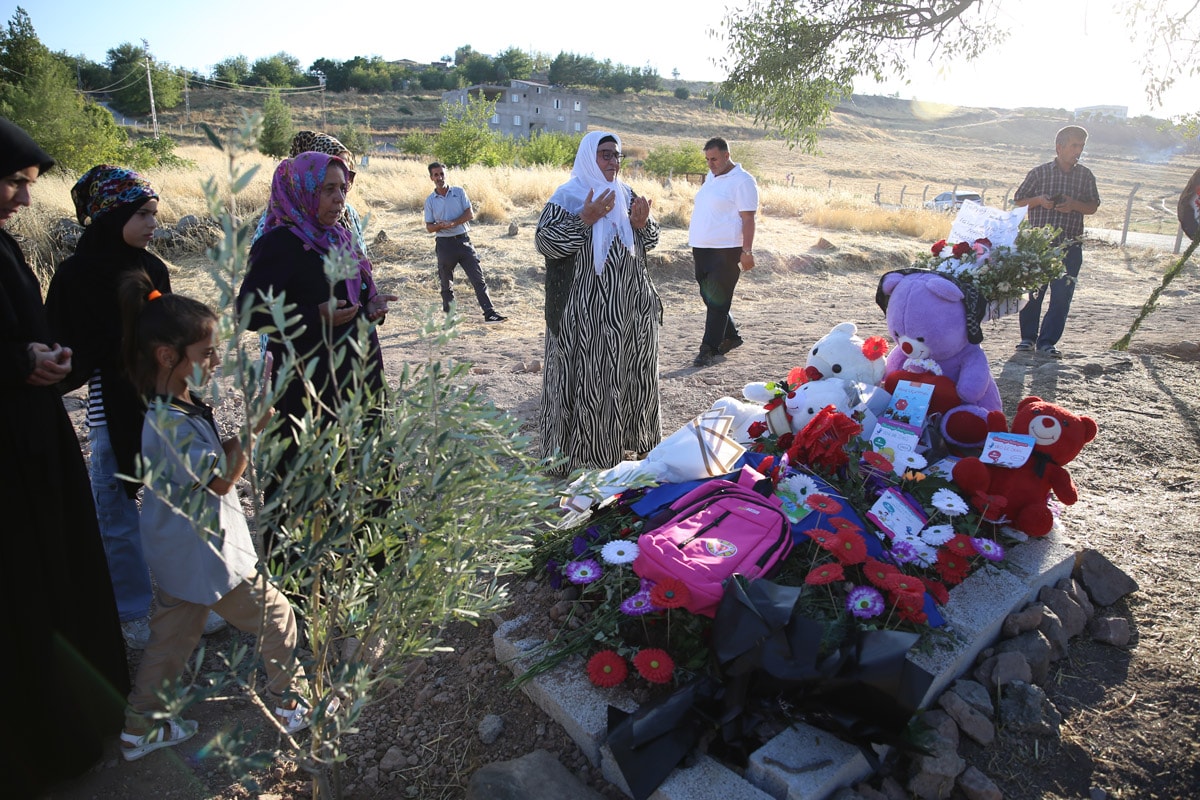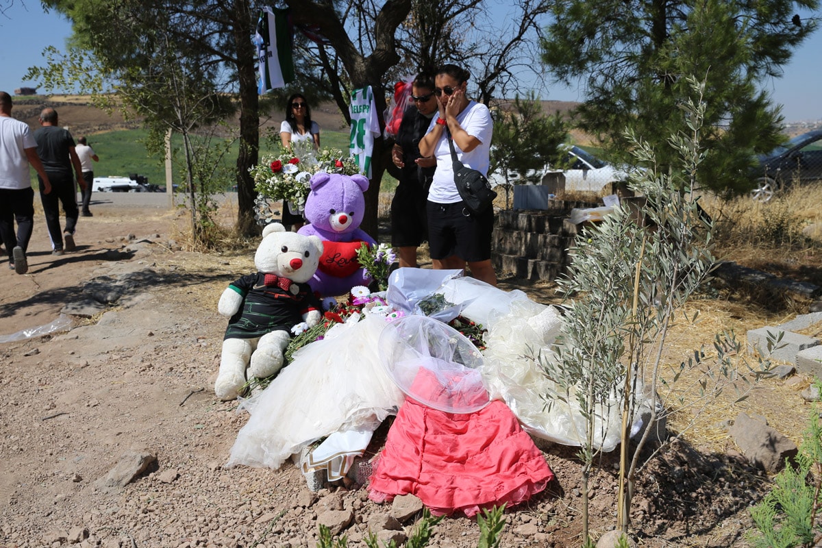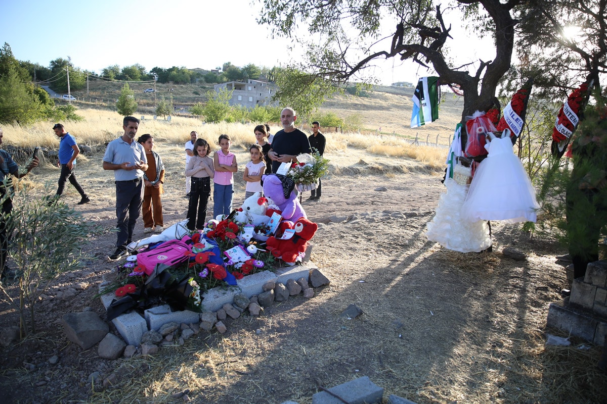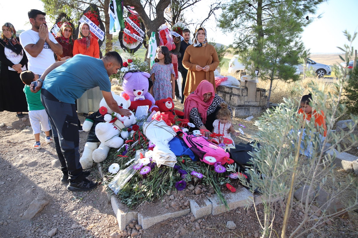 Bazı ziyaretçilerin mezara gelinlik, çiçek, çelenk, hikaye kitabı, okul çantası bıraktığı ve gözyaşı döktüğü görüldü.