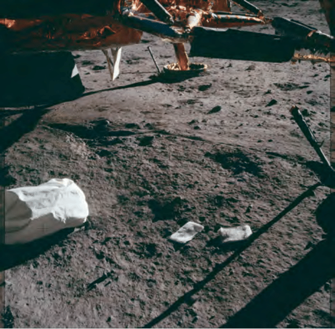 İçi dışkı dolu torbalar ve tanklar, aya yapılan yolculuk boyunca astronotların yanında aya gitti. Öyle ki, bu tank ve torbaların yaklaşık 70 tanesi şu an hala bir köşesinde duruyor. Neil Armstrong'un ayda çektiği ilk fotoğraf, bu torbalardan birini içeriyor.