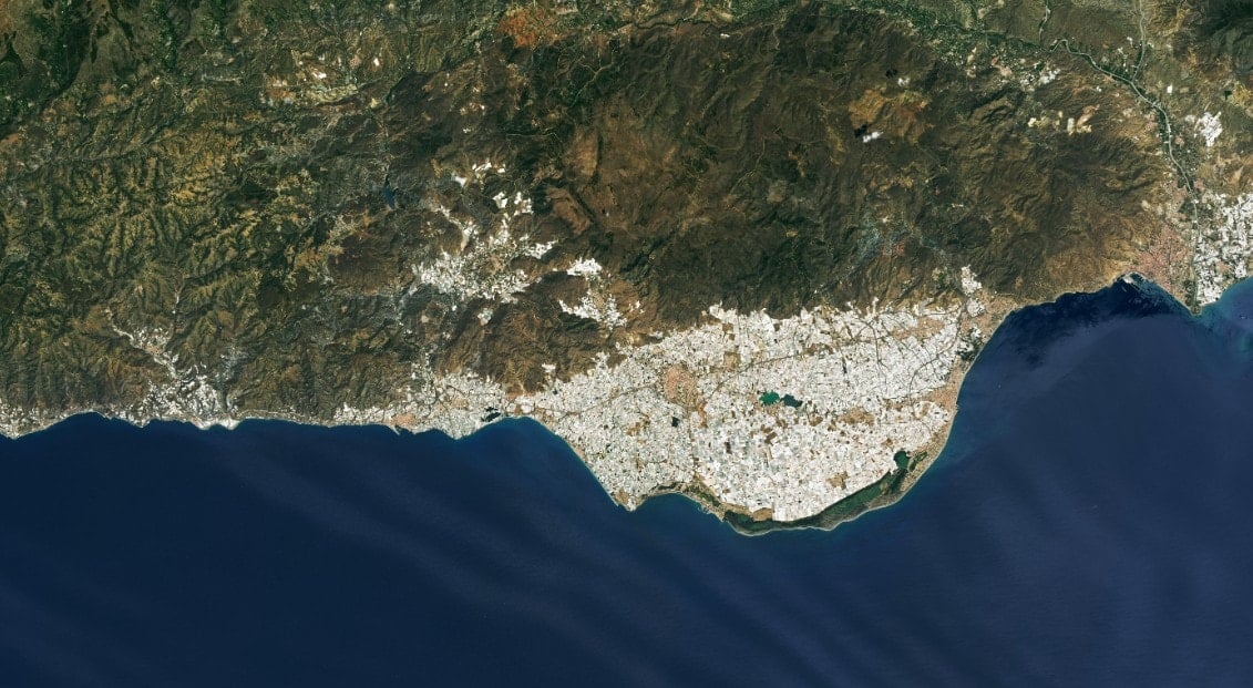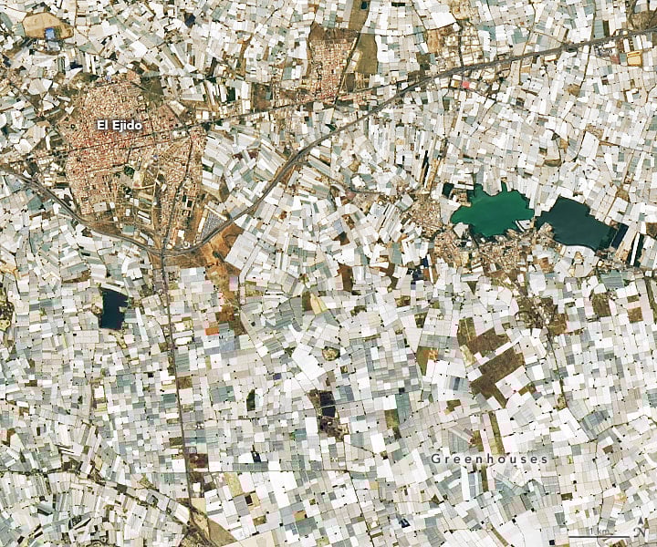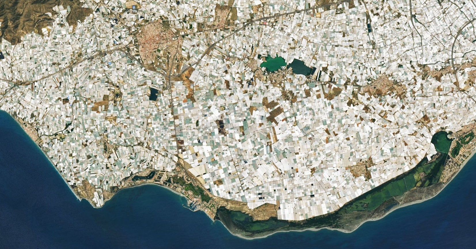 İspanya’nın güneydoğusunda, Almería’da bulunan bu seralar, uzaydan bakıldığında beyaz bir battaniyeyi andırıyor. Uydu görüntülerinde karla kaplı bir alan gibi görünen bu geniş beyazlık, aslında sera yapımında kullanılan plastik levhalardan kaynaklanıyor. Akdeniz’in mavi sularıyla birleşen bu plastik deniz, uzaydan net bir şekilde seçilebiliyor.