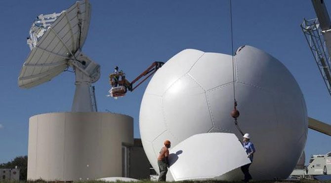 NASA'nın Florida'daki Kennedy Uzay Merkezi'ndeki bu büyük parlak beyaz top, Mars'a astronot gönderme hedefinin başarılı olması için gerekli olan pek çok önemli yer sisteminden sadece biri. Yukarıdaki fotoğrafta, teknisyenlerin küreyi üretme süreçleri gözüküyor. Bu küre, yeni S-bantı anten (sol tarafta) için hava durumlarına karşı dayanıklı bir kapalı alan olarak çalışmakta ve bu anten, uzay ajansının Space Launch System roketinin fırlatılması ile beraber karmaşık bir takip yeteneğine sahip olmak için tasarlanmış.