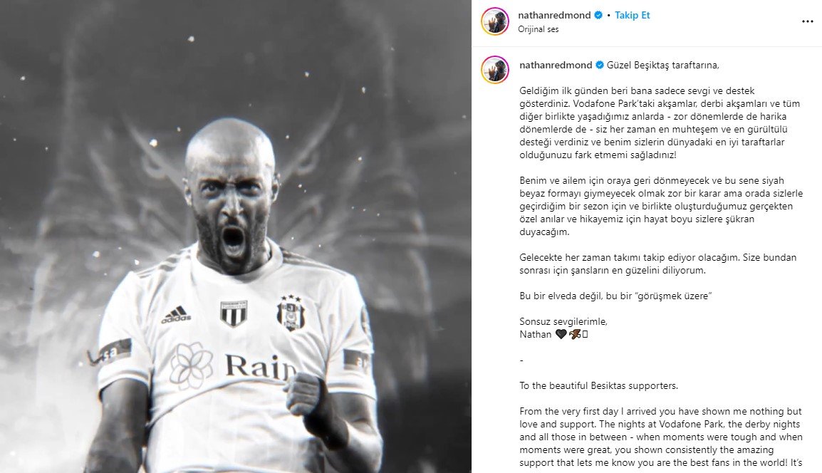 Beşiktaş'ın yeni sözleşme önerdiği ancak uzun süredir olumlu yanıt alamadığı Nathan Redmond, sosyal medya hesabından Beşiktaş'a veda etti.