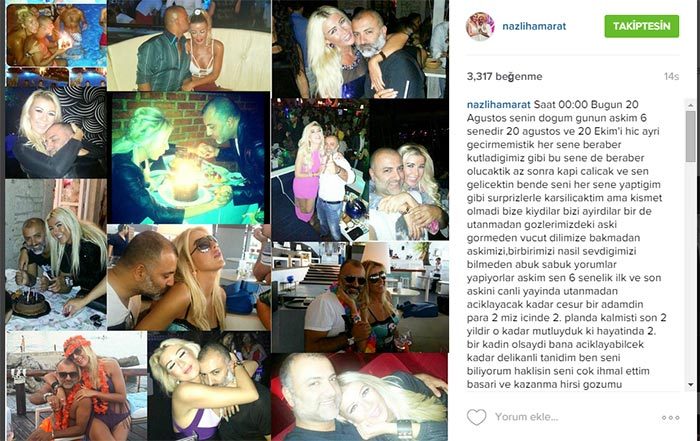Saat 00:00... Bugün 20 Ağustos senin doğum günün aşkım 6 senedir 20 Ağustos ve 20 Ekim'i hiç ayrı geçirmemiştik. Her sene beraber kutladığımız gibi bu sene de beraber olacaktık. Az sonra kapı çalacak ve sen gelecektin. Ben de seni her sene yaptığım gibi sürprizlerle karşılayacaktım ama kısmet olmadı. Bize kıydılar bizi ayırdılar. Bir de utanmadan gözlerimizdeki aşkı görmeden vücut dilimize bakmadan aşkımızı, birbirimizi nasıl sevdiğimizi bilmeden abuk sabuk yorumlar yapıyorlar. Aşkım sen 6 senelik ilk ve son aşkını canlı yayında utanmadan açıklayacak kadar cesur bir adamdın. Para ikimiz için de 2. planda kalmıştı. Son 2 yıldır o kadar mutluyduk ki, hayatında 2. bir kadın olsaydı bana açıklayabilecek kadar delikanlı tanıdım. Ben seni biliyorum. Haklısın seni çok ihmal ettim. Başarı ve kazanma hırsı gözümü bürüyünce hiçbir şey görmüyorum.