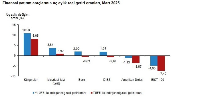 Türkiye İstatistik Kurumu (TÜİK), mart ayına ait finansal yatırım araçlarının reel getiri oranlarını açıkladı. Buna göre, mart ayında yatırımcısına en yüksek reel kazancı sağlayan araç Euro oldu.