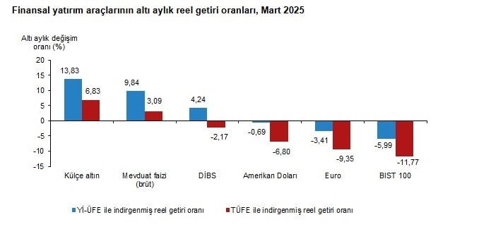 Altı aylık değerlendirmeye göre külçe altın; Yİ-ÜFE ile indirgendiğinde yüzde 13,83, TÜFE ile indirgendiğinde ise yüzde 6,83 oranlarında yatırımcısına en yüksek reel getiri sağlayan yatırım aracı olurken; aynı dönemde BIST 100 endeksi, Yİ-ÜFE ile indirgendiğinde yüzde 5,99, TÜFE ile indirgendiğinde ise yüzde 11,77 oranlarında yatırımcısına en çok kaybettiren yatırım aracı oldu.